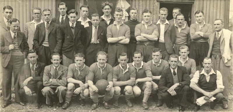 Boston United squad before the match at Shodfriars Lane against Bergen op Zoom on Sat 24th Aug 1946. The team was: Ted Eaglen, Phil Bartley, Cook, Bill Pate, Joyce, Jim Harris, Roy Houghton, Bill Harvey, Harry Sharp, Martin, Tommy Mitcham. In the photo Standing: J.Ostler, R.A.Dilley, Luesby (directors), F.Chapman, Rippin, Elsam, Crossley, McClure, Howard, Joyce, Eaglen, Pate, Dickinson, Harmston, Harvey, Houghton, and W.Toynton. Bottom row: Drury, Kent, Bartley, Harris, Sharp, Mitcham, Martin, F.Tunstall, Cook, E.Howard.